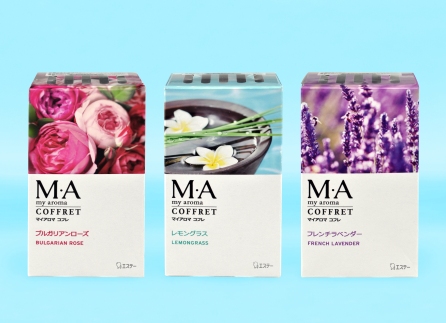 「マイアロマ コフレ」は、天然エッセンシャルオイルを配合した上質なアロマが洗練されたデザインの箱(コフレ)から広がる小箱タイプの置き型リキッド芳香剤です。〈ブルガリアンローズ〉、〈レモングラス〉、〈フレンチラベンター〉の3つの香りをラインナップします。