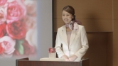 2.この4月に新発売する「マイアロマ コフレ」の紹介を始める女性司会者。