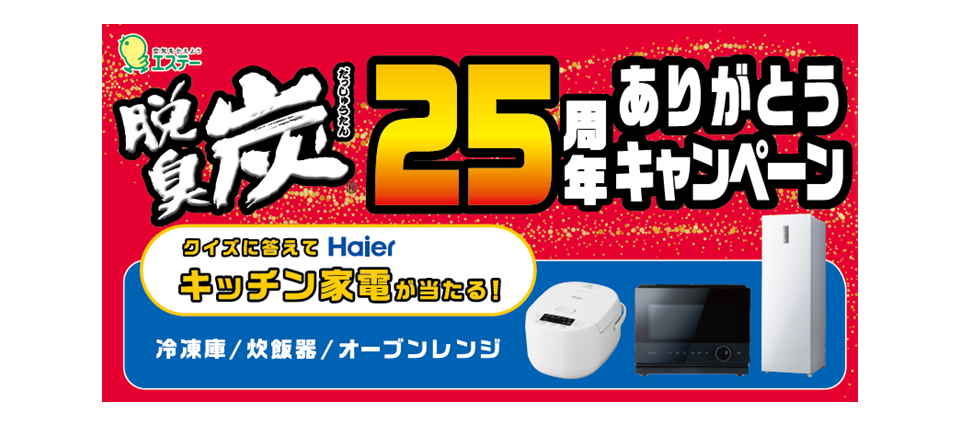 エステー株式会社は、ゼリー状の炭が小さくなることで使い終わりがひと目でわかる脱臭剤「脱臭炭」の発売25周年を記念し、日ごろの感謝を込めて、ハイアール ジャパン セールス株式会社とコラボした「脱臭炭25周年ありがとうキャンペーン」を実施。ハイアール製の冷凍庫やオーブンレンジ、炊飯器といったキッチン家電を抽選で合計25名様にプレゼントいたします。