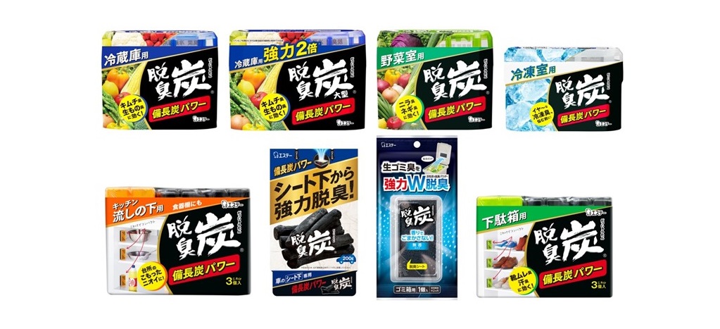 (商品左から)「脱臭炭 冷蔵庫用」、「脱臭炭 冷蔵庫用 大型」、「脱臭炭 野菜室用」、「脱臭炭 冷凍室用」「脱臭炭 キッチン・流しの下用 こわけ 3個入」「脱臭炭 クルマ用 シート下専用 200g」、「脱臭炭 ゴミ箱用」、「脱臭炭 下駄箱用 こわけ 3個入」