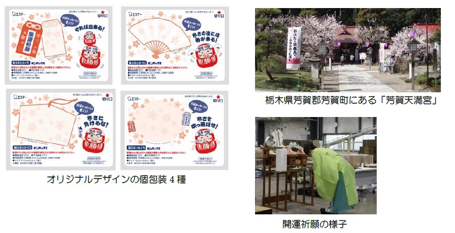「オンパックス 開運祈願 貼らないカイロ」は、エステーのカイロ製造工場がある栃木県「芳賀天満宮」から宮司を招き、生産開始時に開運祈願をしたカイロです。