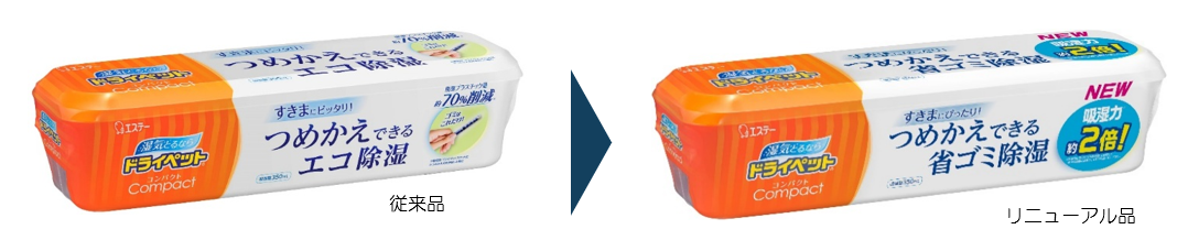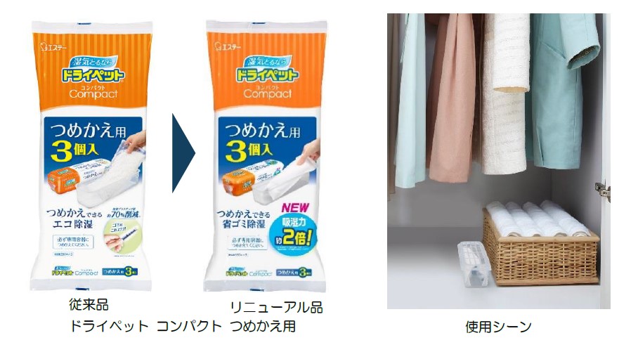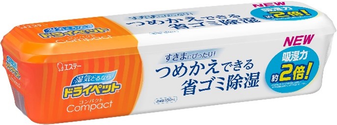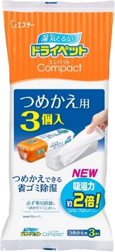 エステー株式会社は、容器を繰り返し使える省ゴミタイプの「ドライペット コンパクト」及び「ドライペット コンパクト つめかえ用 3個入」の吸湿力をこれまでの約2倍(※1)に高めるリニューアルをおこない、2月9日から全国のスーパー、ドラッグストア、ホームセンター、ネットショップなどで新発売します。