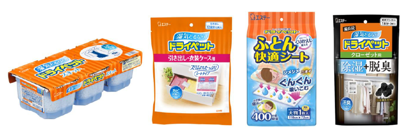 (商品左から)「ドライペット スキット 3個パック」、「ドライペット引き出し・衣装ケース用 12枚入」、「ドライペット ふとん快適シート」、「備長炭ドライペット クローゼット用 2枚入」