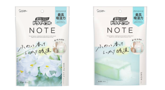 さらに2025年8月には、収納環境に上質で清潔感のある香りがふわっと広がる、除湿剤の「ドライペット NOTE 置き型タイプ」を発売。リリーやローズなどのフローラルに包まれた清潔感のあるホワイトリリーの香りです。湿気やニオイが気にならず、清潔感のある香りで理想の収納環境作りをサポートします。