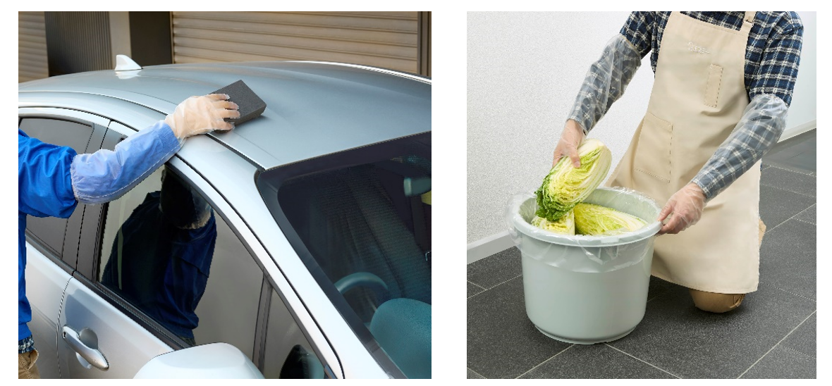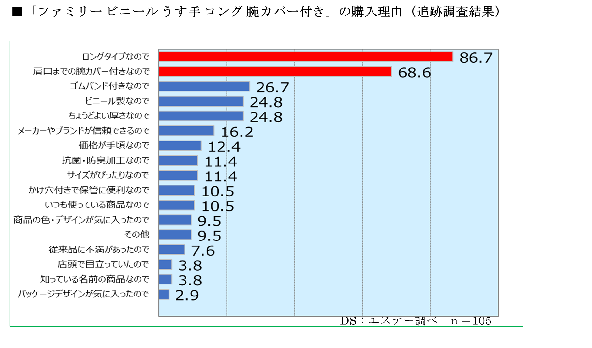 “ロング”タイプの家庭用手袋「ファミリービニール うす手 ロング 腕カバー付き」の購入理由を調査したところ、「ロングタイプなので(86.7%)」や「肩口までの腕カバー付きなので(68.6%)」といった理由が多くの回答を集め、自動車洗浄や食器洗い、風呂掃除など、袖が濡れたり、腕まくりが必要なシーンにおいて活用されていました。