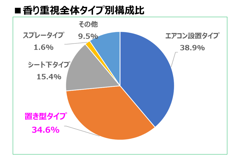 また、香りを重視した製品の構成比をタイプ別でみると、「エアコン設置タイプ」が38.9%と一番多く、次いで「置き型タイプ」が34.6%となり、24年には前年比107.8%と人気が高まっています(※2)。