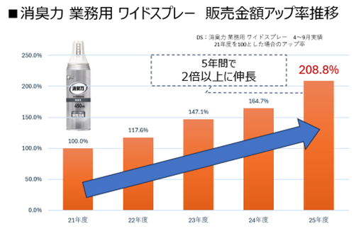 既存品の「消臭力 業務用 ワイドスプレー」の販売金額アップ率の推移をみると、21年度から25年度の5年間で2倍以上に伸長しており、とくに宿泊施設や介護施設、オフィスなどでの需要が増加傾向です。これをうけ、公共空間や各種施設における消臭ニーズのさらなる拡大を見据え、「消臭力 業務用 ワイドスプレー」と機能面で差別化を図った「消臭力 業務用 ロングジェット」を開発しました。