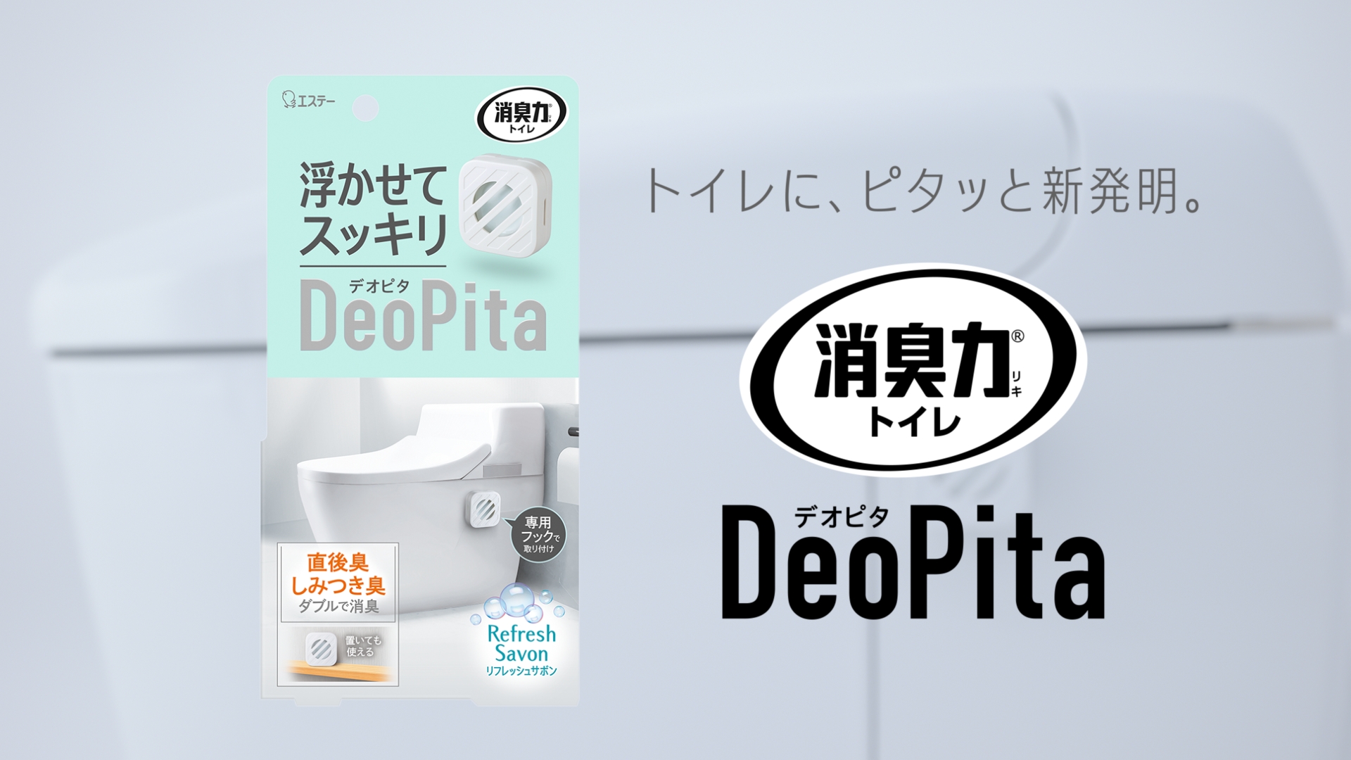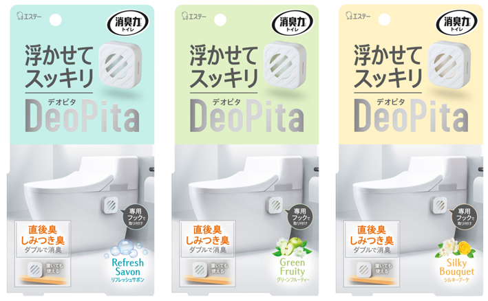 「消臭力 DeoPita トイレ用」は、置くだけでなく、トイレやタンク側面、壁などに取り付けることで、場所を取らずに“浮かせて”使えるトイレ用消臭芳香剤です。