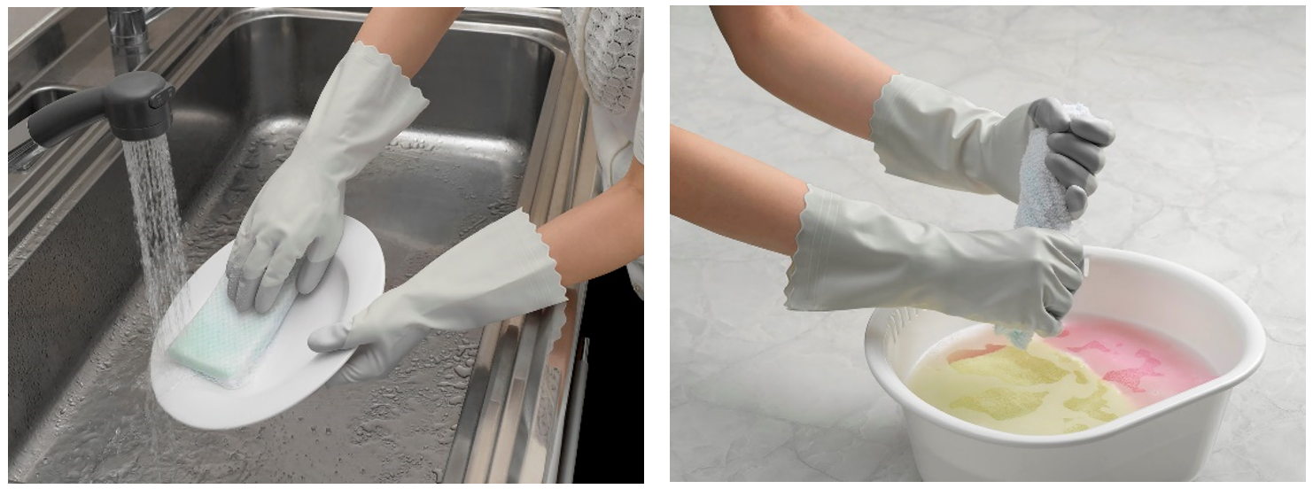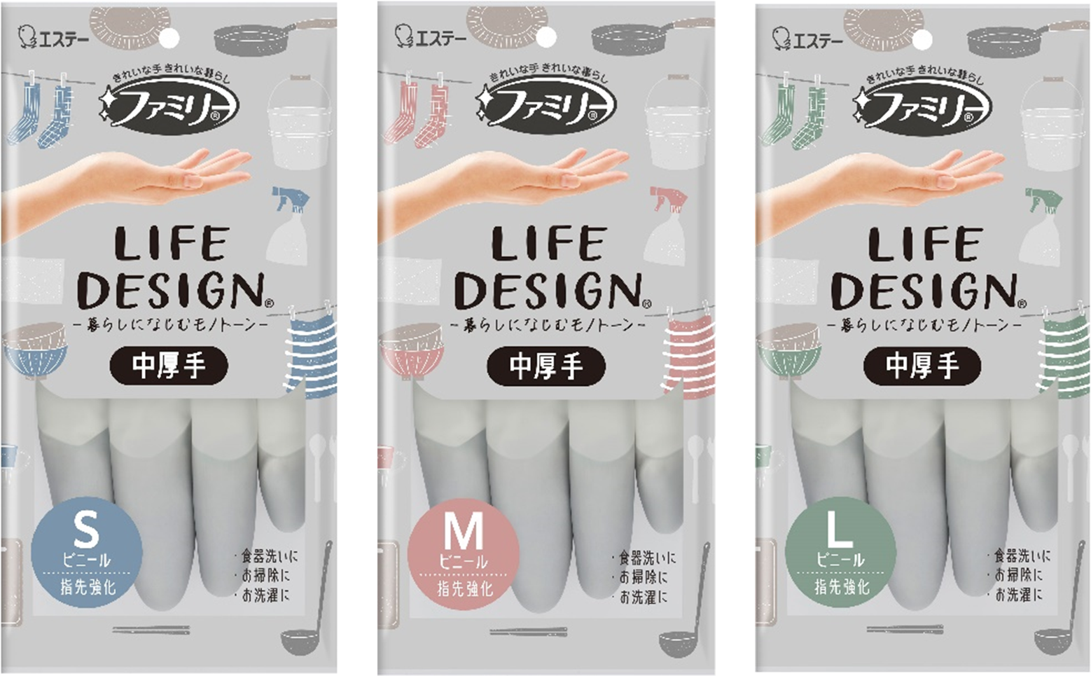 カラーは、暮らしになじみ、汚れが目立ちにくい薄いグレーをベースにしており、サイズはS、M、Lの3種類。食器洗いやお掃除、お洗濯など、暮らしの様々なシーンで活用できます。