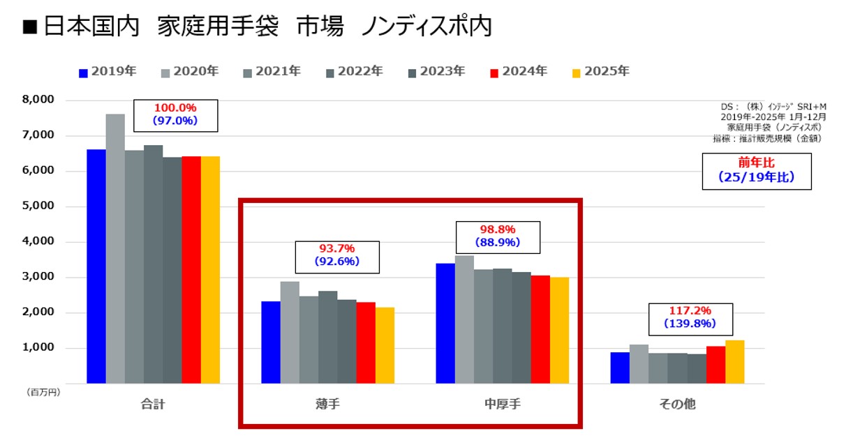 繰り返し使用できる“ノンディスポタイプ”の家庭用手袋市場において、“うす手”や“中厚手”の推計販売規模は、近年横ばいが続いています。