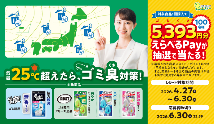 「消臭力 ゴミ箱用×脱臭炭 ゴミ箱用 気温25℃超えたら、ゴミ臭(くさ)対策!キャンペーン」を実施 ~抽選で「えらべるPay 5,393(ゴミくさ)円分」を100名様にプレゼント~ 応募期間:2026年4月27日~2026年6月30日