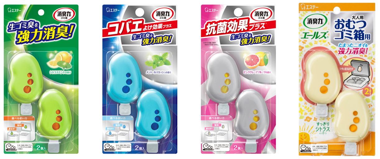ラインナップは、すっきり消臭する「消臭力 ゴミ箱用」〈シトラスミントの香り〉、コバエを寄せ付けない忌避成分(※4)配合の「消臭力 ゴミ箱用 コバエよけ効果プラス」〈メントールスカッシュの香り〉、生ゴミ臭の原因菌の増殖を抑える抗菌成分(※4)(※5)配合の「消臭力 ゴミ箱用 抗菌効果プラス」〈ピンクグレープフルーツの香り〉、使用済みの大人用おむつや尿取りパッドを捨てるゴミ箱から漏れるニオイを消臭する、介護専用の「消臭力 エールズ おむつゴミ箱用」です。